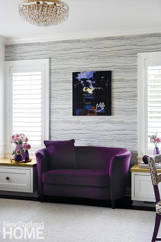The final piece to the art puzzle didn’t fall into place for another year. Moss Design reached out to New York-based art advisor Betsy Biscone to help find the perfect piece for the his-and-her office space. Biscone presented Will Be Home By 5 P.M., a semi-figurative Flashe-and-oil painting by emerging artist Hiejin Yoo. “They initially passed on it,” remembers Biscone, “but they kept coming back to it. They loved the story behind it—the car pulling away from the home, reluctantly waving goodbye to go to work.”