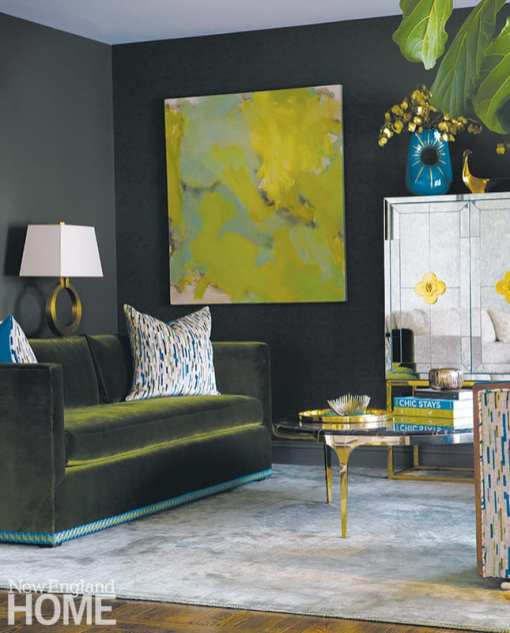 Yanni says the client quickly understood the importance of having fine art in her family’s home, but purchasing the right pieces doesn’t happen overnight. It was seven months later that everyone involved fell under the spell of an abstract painting for the formal living room. Serendipitously, the painting comes from artist Willie Cole, who also works as a photographer and who photographed the home. The painting, Series 1, worked well with the room’s saturated greens, golds, and blues.