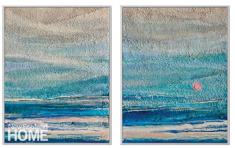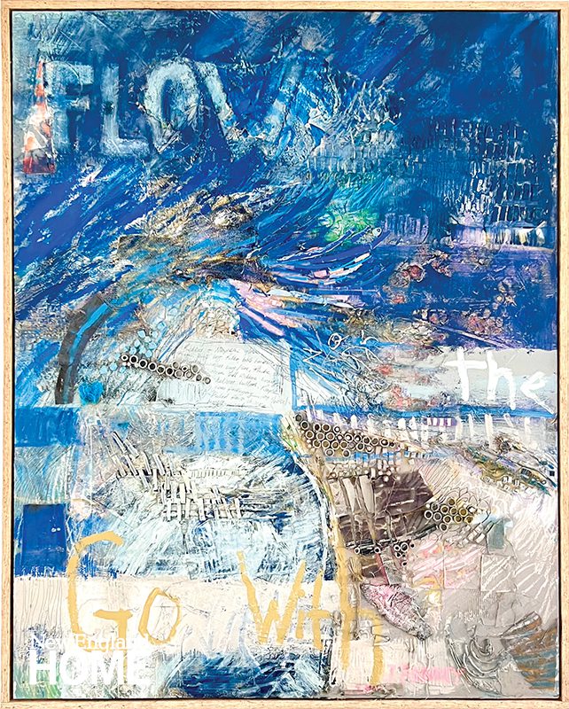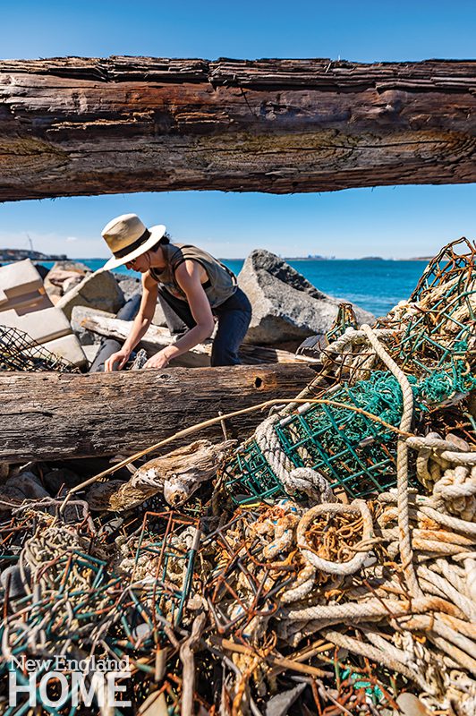 The answers to these questions came to her while walking the beach near her home in Hull, Massachusetts, doing her daily trash pick-up. She noticed that a particular scrap from a fiberglass boat hull, with its blue-green patina, was actually quite beautiful. It dawned on her that rather than dump all that flotsam she’d collected into a landfill, she could use it in her art.