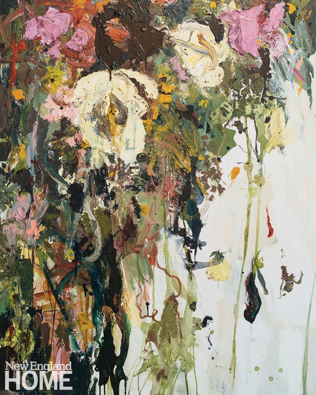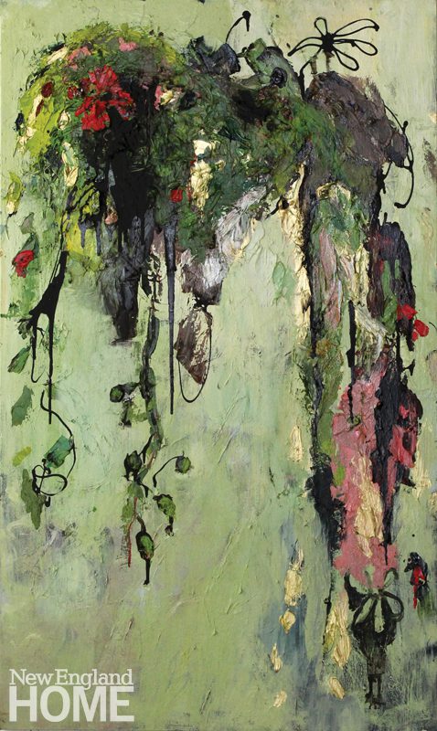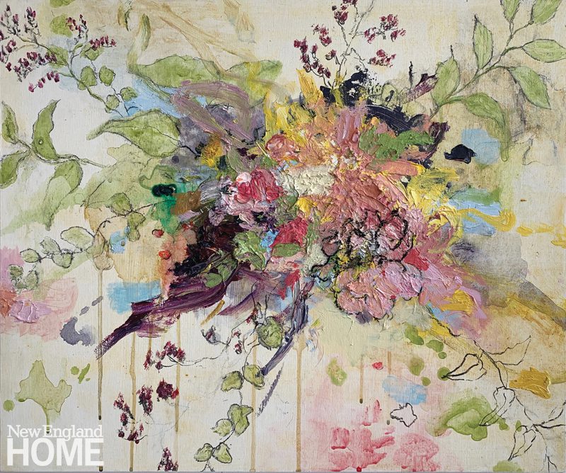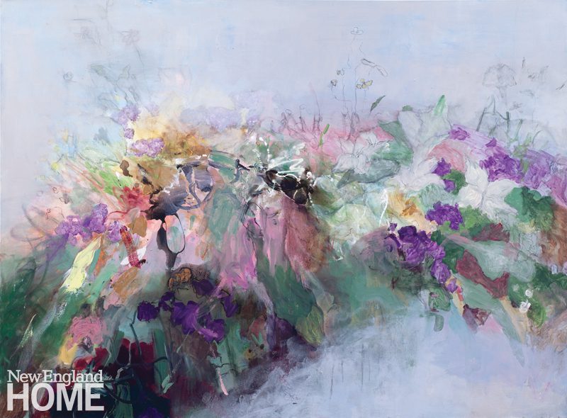 As she sits in her spacious, light-filled studio in Waltham, Massachusetts, Sarah Meyers Brent points to a recently finished painting, Beyond the Rainbow, and confesses, “Like a lot of my work, this piece is partly about contradictions.” At first glance the large (forty-eight and a half inches by sixty-six inches) acrylic-and-charcoal painting looks like a lively, expressionistic floral display. But look closer. Amid the colorful blooms bursting with energy are withered, lifeless flowers. “I wanted to include both growth and decay,” she explains. “Because there is a beauty in both.”
