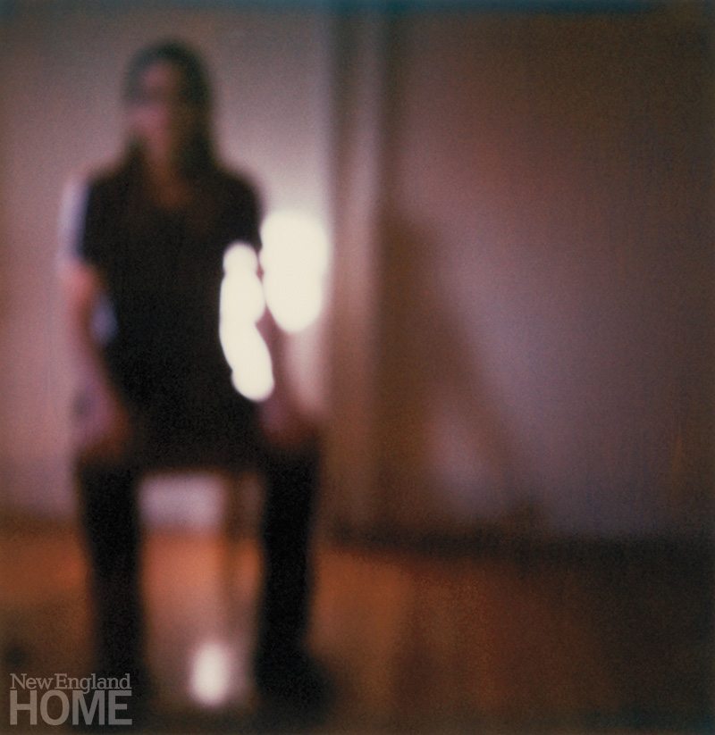 Mikula regards the printing, mounting and installation of her photographs as almost as important as the images themselves. For her 2006 series, 9 Portraits, the Polaroids were printed on nine-foot panels of industrial mesh, suspended from the ceiling of the 4-H Exhibition Hall at the Northampton Fairgrounds. The rustic space was a deliberate challenge to the formal way of looking at art. Despite its monumental size, the figure of a seated woman in 9 Portraits #9 resembles a delicate Giacometti sculpture, formed in part by light and shadow.