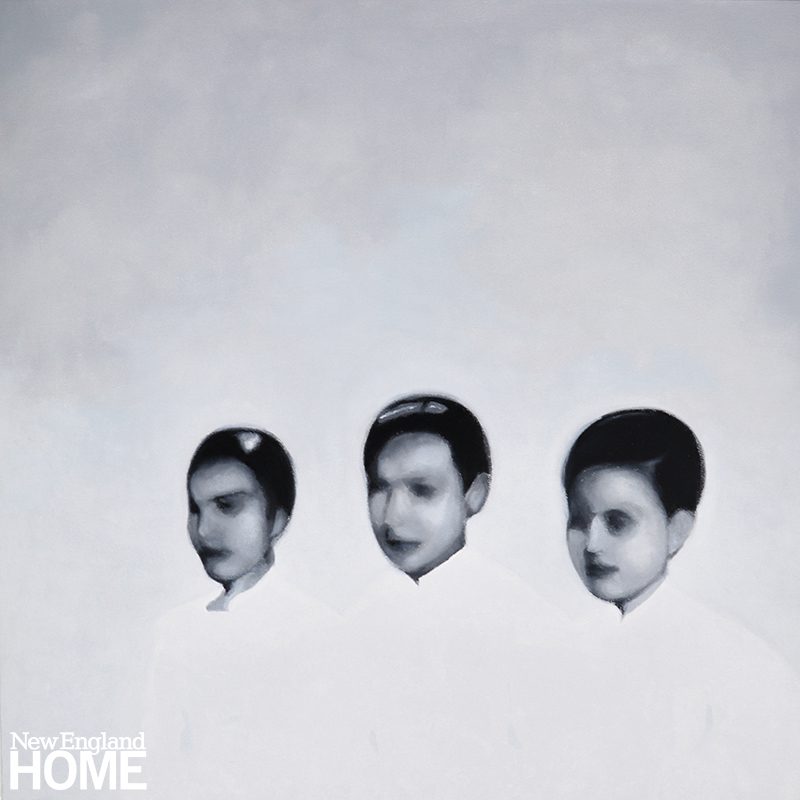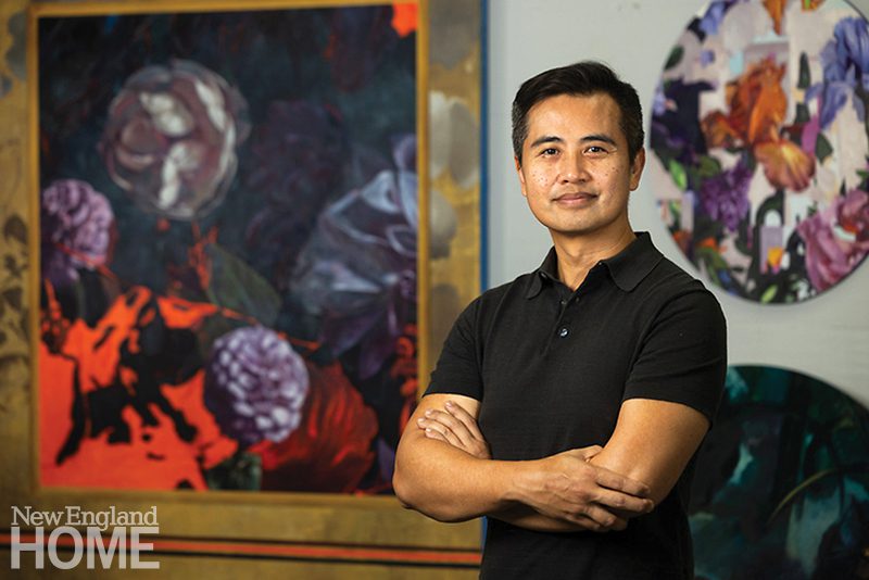 Vu matches different artistic techniques to the ideas he wants to explore, which has resulted in series of works, each with a distinctive look. His Kintsugi series, for instance, employs precise, graphic, and colorful depictions of flowers to express his interest in kintsugi, the Japanese artform of repairing broken pottery, often with precious metals, that serves as a metaphor for the beauty that can be found in our flaws and scars. For his Transients series, he paid homage to a technique used in Vietnam for duplicating and enlarging family photographs that involves dabbing charcoal powder onto paper with tiny felt-tipped brushes, creating haunting portraits of people isolated and disoriented by their refugee experience. “Coming to the U.S. can be confusing, it can be strenuous, it can be terror-infused,” says Vu, “but it can also be hopeful and beautiful.”
