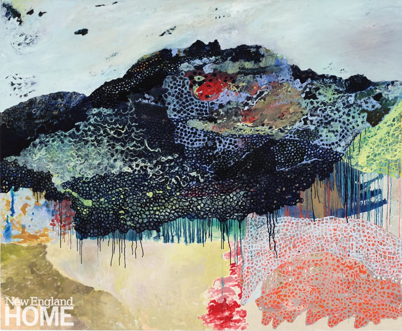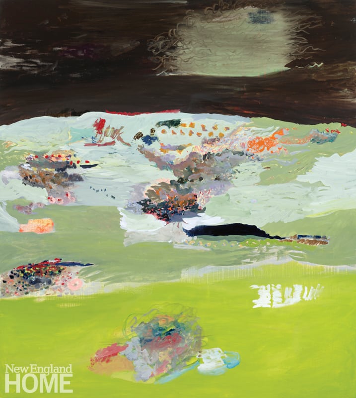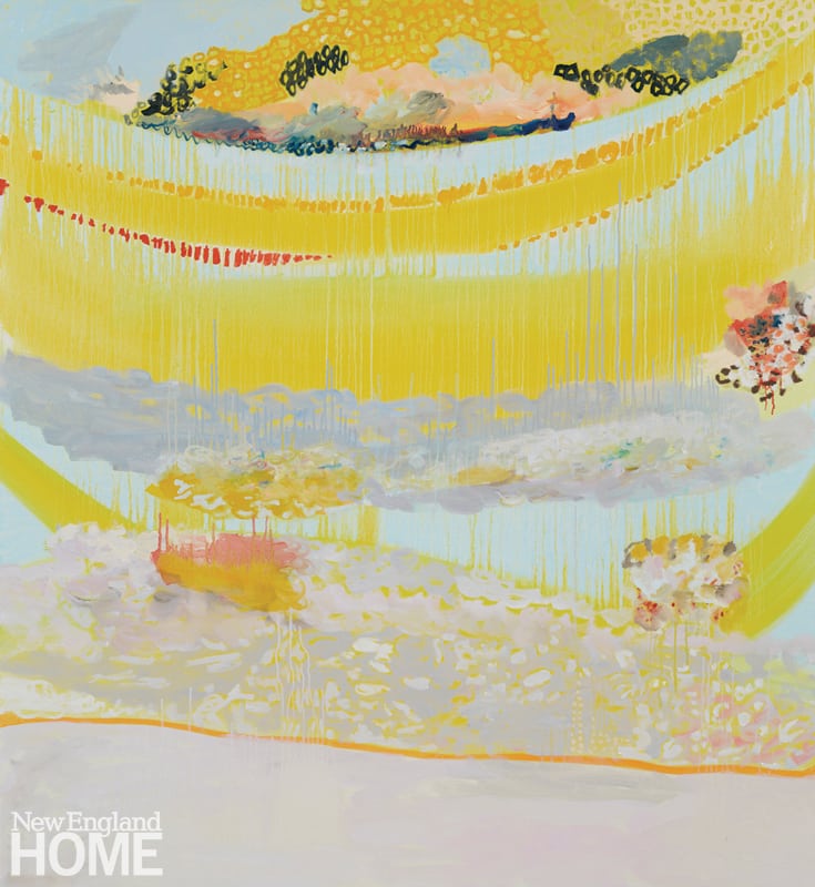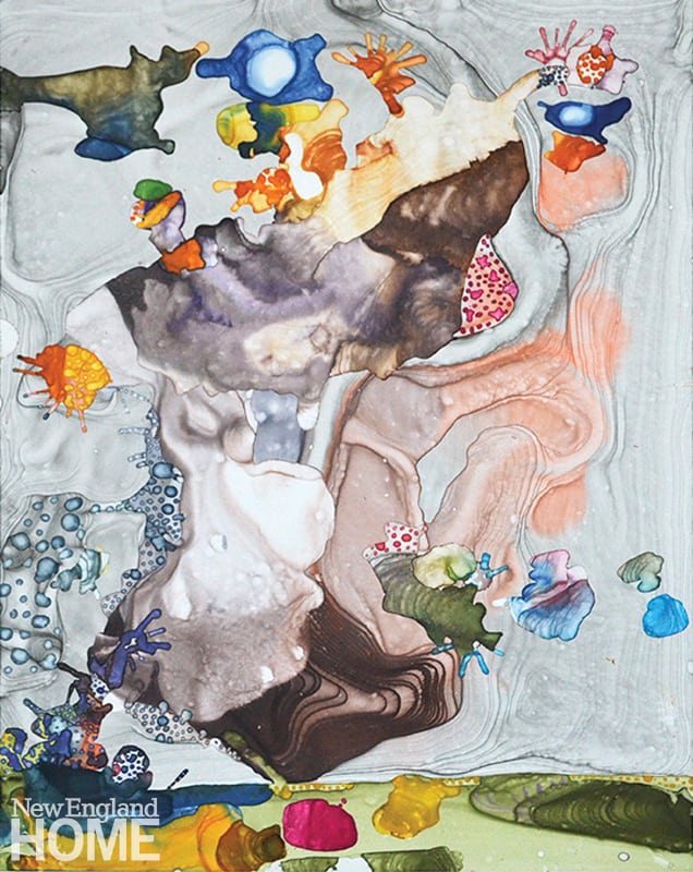 The artist, who lives in Brookline, Massachusetts, and has a studio in nearby Somerville, brushes, drips, pours, layers, glazes, and “doodles” paint to produce her abstract works. “I love to experiment with paint,” she says. “I may begin a painting by laying a stretched canvas on the floor and dripping very liquid paint onto it; then I’ll lift it or turn it to let the paint drip upward, as if it is defying gravity. After it’s dry, I may place paint over paint and add tiny brushstrokes as well as bolder swatches of paint. My work is all about mark making, spontaneity, and the possibilities—the freedom—of abstract art.”