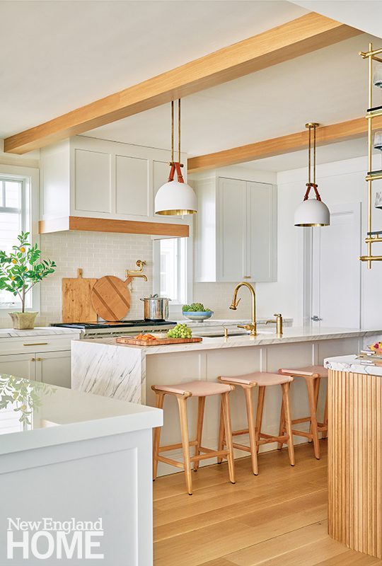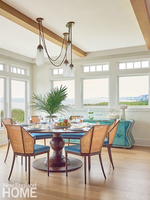 “The beach is their backyard, but the owners didn’t want a beach-bungalow vibe,” says De Maria. Instead, copious use of marble and glass adds a veneer of sophistication and elegance to spaces with stand-out organic elements like the dining room’s decorative wood ceiling beams, the kitchen’s white-oak-trimmed range hood and pendants suspended from saddle-leather straps, and the living room’s jute-backed chairs.