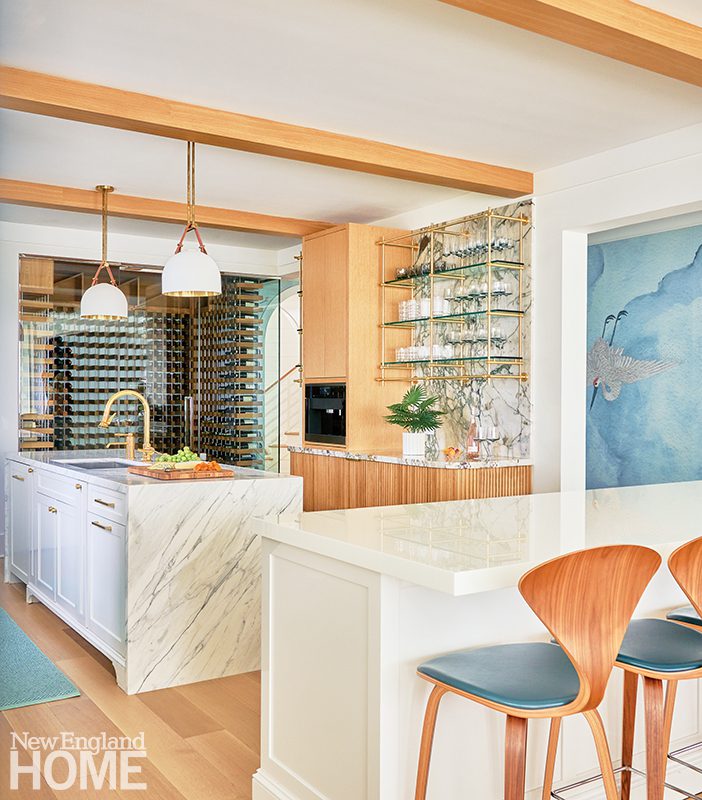Gold tones, meanwhile, make mostly understated appearances throughout the home, particularly in the kitchen where Moss Design added brass-framed glassware shelves to complement the wine storage that dominates an entire wall. Sink fixtures and cabinet hardware, likewise, have a brassy sheen. Even some natural elements, like a tripod table in the primary bath, get a little pizazz. The team applied a gilded veneer to the table’s three legs that otherwise resemble tree branches.