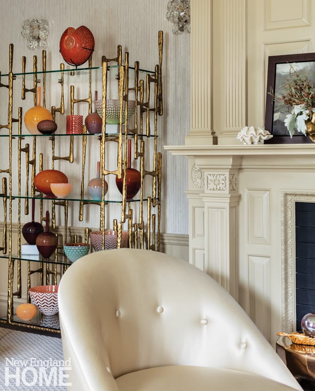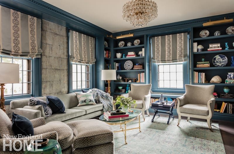 In the paneled library off the entry hall, Pribell treated the woodwork to a saturated shade of blue. The color finds echoes in ceramics displayed on the shelves. “Because the China Trade was both a vital source of New England wealth and responsible for the marvelous history of blue-and-white ceramics, we were inspired to accessorize with Kangxi porcelain, Chinese exportware, Dutch delftware, and Canton,” she says.