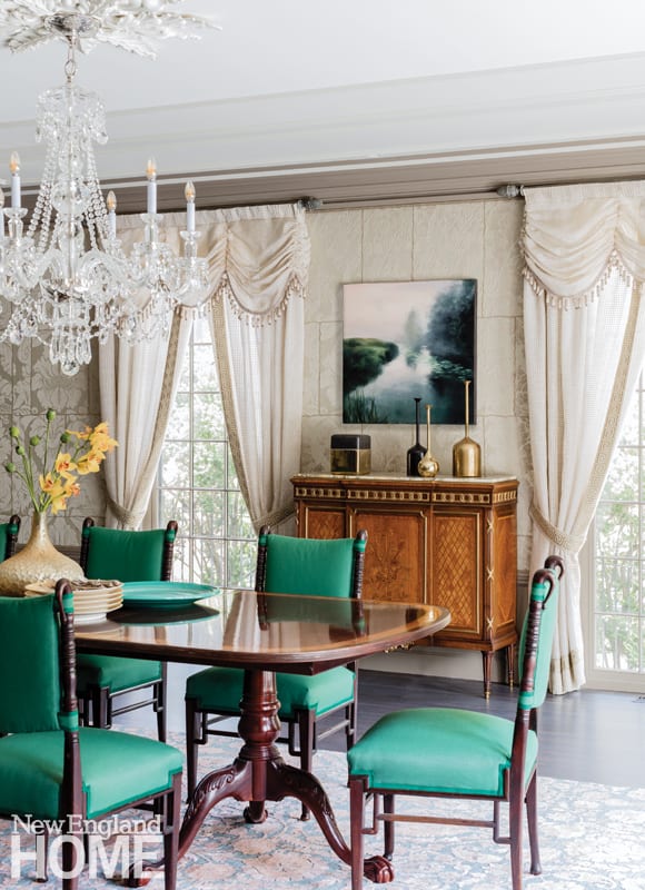 The front entrance packs a dramatic wallop with its vast, Jacobean-influenced fireplace, a grand staircase, and elaborately carved millwork. “One of the critical changes I made was to transform this space to look like a club rather than just a pass-through,” Pribell says. She installed new limestone flooring with terracotta insets and set a cozy seating arrangement in front of the welcoming fireplace. A delightful inglenook nestles under the stairs. “At first we thought we’d put a piano there,” the homeowner says,” but Heidi convinced us it would make a wonderful little sitting area.” On the coffered ceiling, Pribell applied pale wallpaper with gold reflective patches. “It’s a bit of glitter that brings light into a space that had been gloomy and dark,” she says.