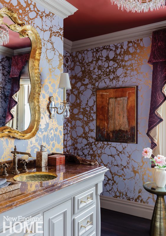 Another brilliant exception to the house’s neutral palette is the half bath off the front entry. Papered with dramatic gold and white wallcovering, the room has a red ceiling, a crystal ceiling fixture, a custom vanity topped with an agate counter, and a voluptuously curved gold-framed mirror.