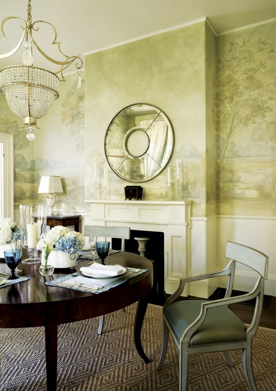 Today, some fifteen years later, Harter teams up regularly with Lawrence, as well as noted Boston-based interior designers Gerald Pomeroy and Charles Spada, creating muted scenes that she describes as “evocative, not descriptive.” Spada comments that he and Harter have worked together on many projects since their early collaborations—a dining-room mural painted in grisage and chinoiserie panels on a large buffet. “Her work is always lovely and appropriate,” he says.