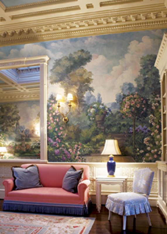 Take, for example, Harter’s mural of a spring garden that rose up on either side of the grand entry stairway in the 2009 Kips Bay Show House, considered by many to be the premier showcase of professional interior design.