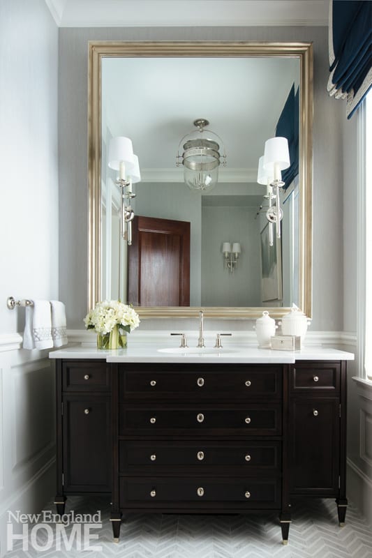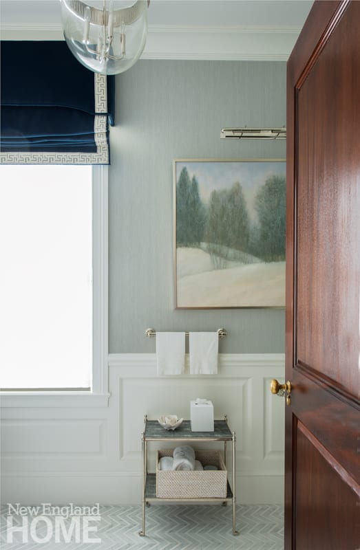 Layers of fine materials abound—from the herringbone floor tiles made of Bardiglio blue and Calacatta gold marble to the custom silver-leaf mirror and the Greek-key trim on the deep-blue velvet Roman shade. The painting, an evocative winter scene illuminated by a picture light, was commissioned for the space. Roughan Interiors designed the dark vanity to provide contrast; it is topped with marble. A small shagreen-and-nickel side table adds function. Says the designer, “I wanted to create drama, but a space that’s comfortable and homey, too. The minute you walk in, there’s a sigh.”