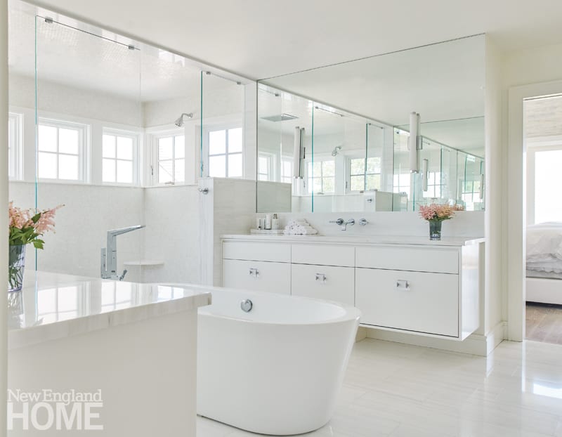 Designer Julie Nightingale describes the house overlooking Long Island Sound in Rowayton as all white, glass, silver, and sparkle—and she means that in the best possible way. Its main bath and one of the powder rooms are two of a kind. The homeowners’ desire for a very large shower overlooking the water inspired the main bath, so the his-and-her space with wraparound windows dominates, but a sleek soaking tub, set in the middle of the room, comes in a close second. “I believe in taking one or two beautiful materials and using an abundance of them,” says Nightingale. In this case, Dolomite marble steals the show on the walls, ceiling, floors, and vanities. Downstairs, wave-like concrete tiles by Artistic Tile—and ten-foot-high ceilings—inspired the powder room. Two strips of the two-foot-wide tiles separated by a mirror covers one wall floor to ceiling. Chosen to be unobtrusive, a gray lacquer vanity intersects the wall treatment, while pendants hang from the ceiling to maintain an uninterrupted flow.