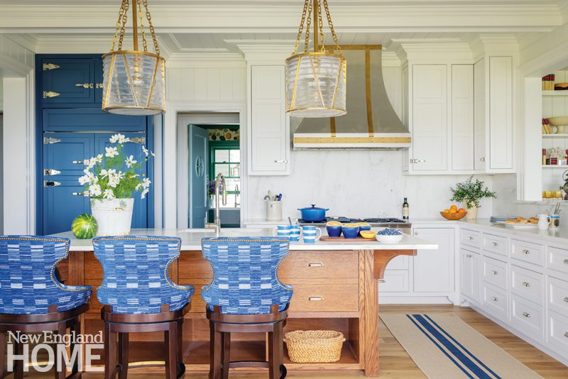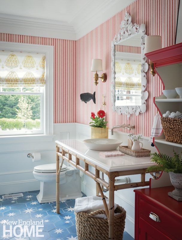 A blue-and-white palette predominates, but here and there Gannon stepped outside the lines. The pantry off the kitchen, for instance, is a delightful departure with cabinetry painted a green pulled in from the gardens outside, and a powder room with red-and-white-striped walls and a star-covered blue tile has all
