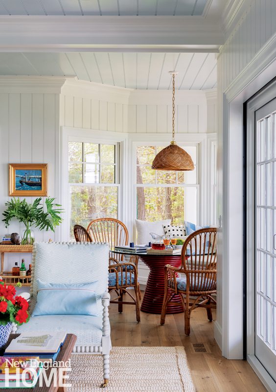 The stairway’s raised platform made a perfect spot for another shot of personality, this time in the form of a table and a favorite painting the owners brought from their suburban Boston home. Much of the home’s furniture, in fact, came along from the owners’ previous house, although Gannon says most of it is unrecognizable. In the living room, a once cream-colored sofa now sports a fun, graphic fabric in red, white, and blue. “It’s a bit of Americana, and it feels Cape Cod but without being too literal,” Gannon says. Bobbin chairs of black with dark-blue velvet were given new life with a coat of white paint and a pretty sky-blue fabric. And the formerly dark coffee table, now wrapped in raffia and painted, looks completely at home in its new setting.