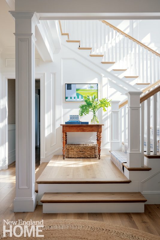 Working with local builder E.J. Jaxtimer, Ahearn gutted the house, creating a more fluid floor plan that lets sunlight flood the home from dawn to dusk and makes the most of the water views. The new architectural details, from the graceful stairway railings to the beadboard ceilings and vertical shiplap walls, are elegant without feeling stuffy.