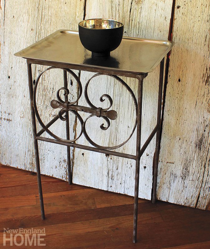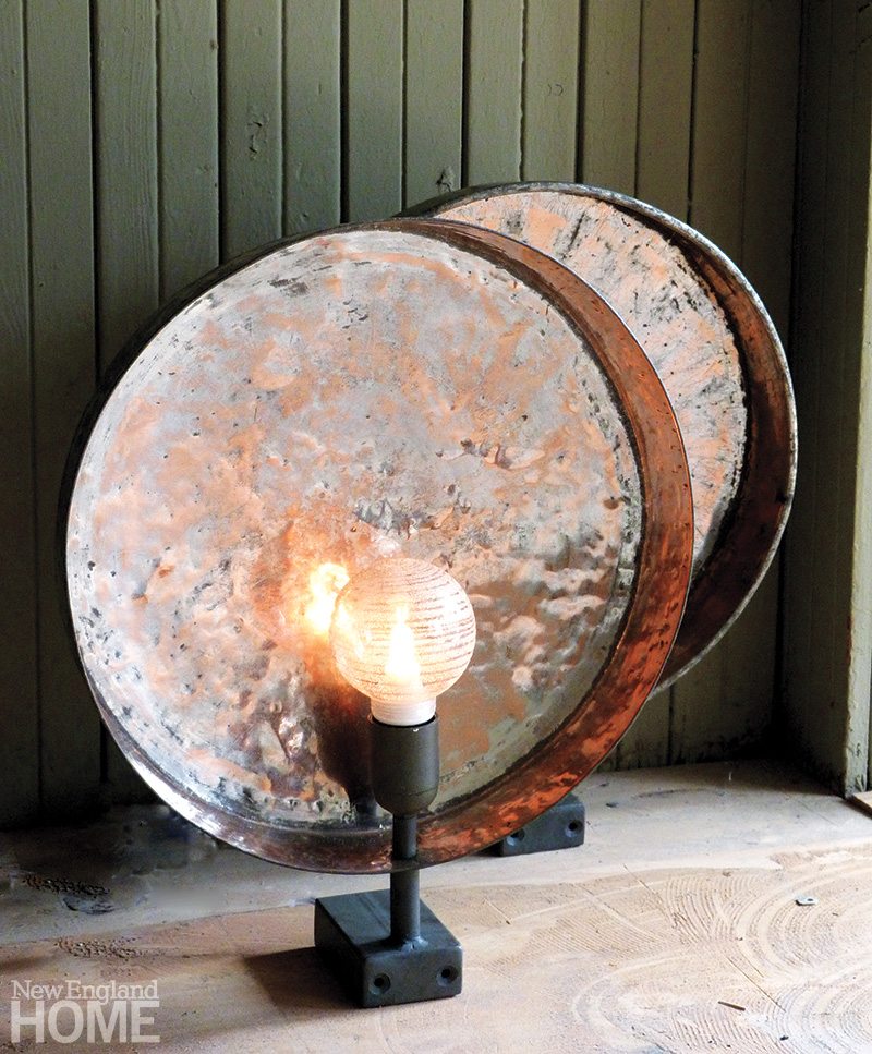 Bénédicte finds wrought-iron pieces, shutters, doors, copper vessels, tiles, and textiles in the war-torn cities and towns of Lebanon. In a Beirut workshop and here in Cambridge, these disparate old house parts become the elements of lamps, sconces, tables, and other home furnishings. She likes to make use of old monogrammed linens, which she dyes, and she commissions mother-of-pearl inlay work from Damascus refugees.
