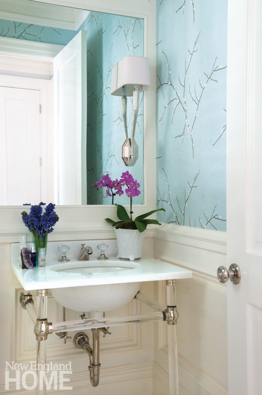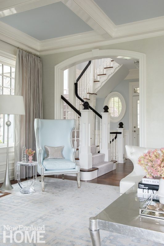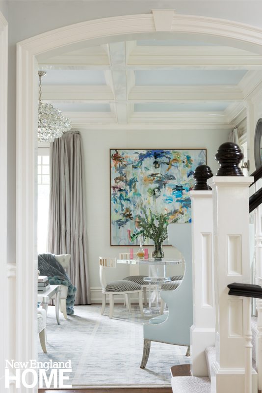 To anchor the living room, the two women worked together to design a custom Tibetan rug of ivory wool with silk detailing in blue, lavender, and mauve. A baby-blue wing chair and a pair of tufted lounge chairs introduce a feminine mystique with their sinuous curves and nailheads that skirt the pieces like a string of silver pearls. On the lounge chairs, Morgan Harrison paired a solid fabric in front with a silvery zebra print on the back for an effect that’s at once tailored and playful. Silver surfaces throughout the room: in the sofa pillows, the silver-leafed legs of the wing chair, and the Chaddock coffee table, also wrapped in silver leaf. A scattering of Lucite accent pieces—including a favorite game table Arredondo brought from her New York apartment—enhances the room’s overall shine. So does the ultra-high-gloss white paint on the molding and the sparkling crystal chandelier by Aerin Lauder—a piece Arredondo initially resisted as too dressy. “Michelle pushed me a little on that, and I’m glad she did,” she says.