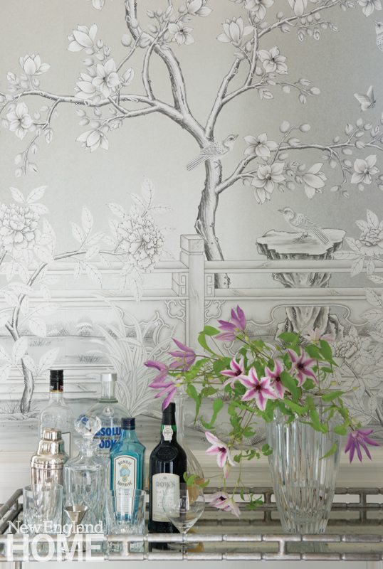 The walls of the dining room, on the other hand, are not intended to recede. Here, Morgan Harrison used a custom wallpaper by Gracie that reflects both Arredondo’s memories of her childhood home and the joyful outlook she embraces today. The two settled on a chinoiserie pattern of birds alighting on trees, and then carefully edited out the birds that looked too aggressive. “I only wanted lovebirds,” Arredondo explains. “I wanted to have that loving energy in my house.”