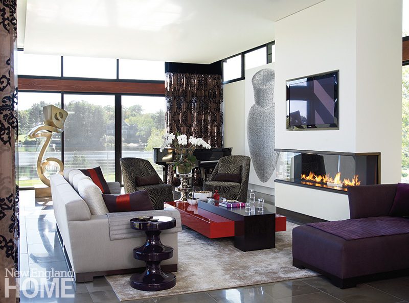 Make no mistake, though, as dazzling and polished as this home looks it’s also—thanks to the astute architects—functional. Just because the breakfast area in the family room includes a circular table by artist-designer Hervé Van der Straeten (who first gained attention for his jewelry designs) and a stunning multi-armed noir chandelier by Baccarat doesn’t mean it’s any less versatile. It’s just that the owners, who collaborated closely with the designer and architects on all aspects of the project, don’t settle for mundane. The gleaming stone floors that run throughout the living spaces reflect a montage of furnishings and fabrics as carefully chosen as their art.