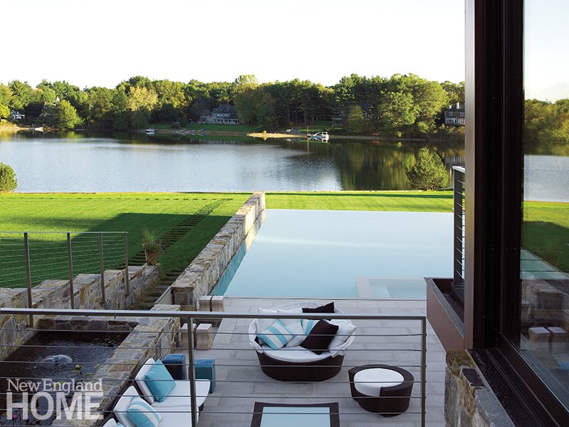 “The pool includes a spa within the rectangular water surface, a perimeter gutter system so that the water elevation is at the same elevation as the stone terrace, and an infinite edge at the far end toward the lake,” explains landscape architect Richard Johnson, who was a principal with Falmouth and Cambridge, Massachusetts–based Stephen Stimson Associates, Landscape Architects at the time and has since formed his own eponymous Falmouth firm.