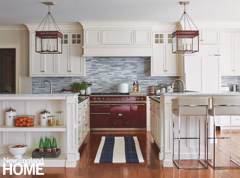 Just look at the kitchen, a collaboration that included the expert help of New Canaan’s True North Cabinets. Twin islands, unending storage, and a commanding Lacanche range further the wife’s passion for baking. The range, in a delicious shade of burgundy red, is “the jewelry of the space,” says Hirsch.