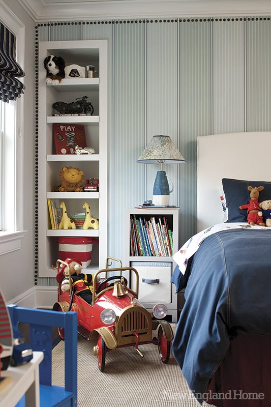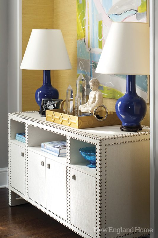 “I didn’t want to do just a navy and aqua room,” says Hiltz. “The room needed a pop and a surprise.” She took a niche that was to be a built-in bookshelf and covered it in a bright-yellow Phillip Jeffries grasscloth. A pair of navy lamps and a colorful abstract by Weston artist Kerri Rosenthal give the room an added jolt.