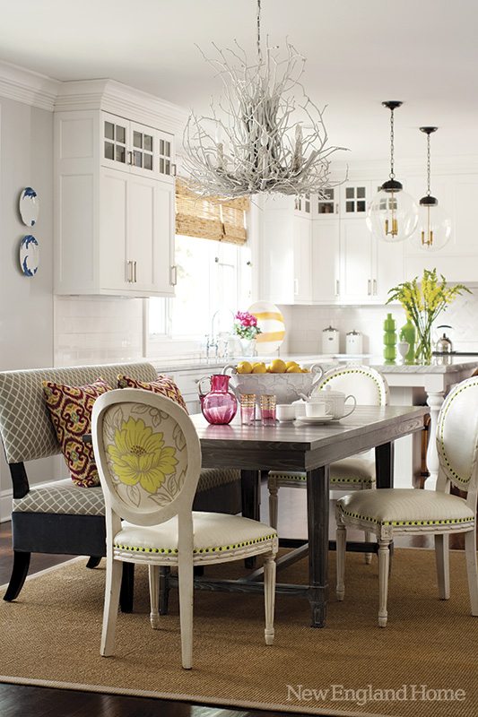 There are a few things a California-raised girl needs if she is to live happily in New England. The practical items include an attached garage and a mudroom, particularly if she’s the mother of three little ones under the age of four and has a 130-pound Bernese mountain dog. The others—likely even more important—are pieces that remind her of her family, along with punches of color to get her through the New England winter.