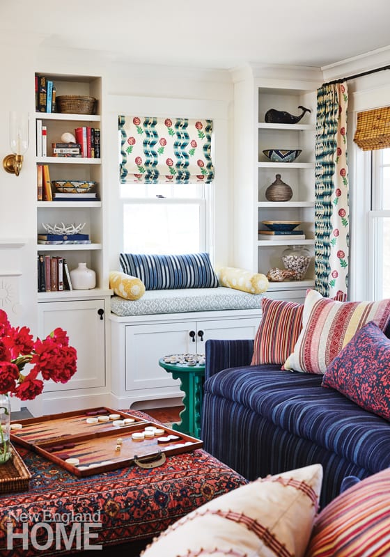 An inventory of the welcoming living area proves her right: the hearth’s handmade delft tiles are classic, the oversize ottoman is upholstered in a stunning antique rug, and there’s not a matchy-matchy fabric in sight. Even the window seats flaunt their own fetching, far-from-ho-hum blend of patterns. Meals transpire around the farmhouse trestle table in the dining area, and what better spot? Throw open the doors to the deck and there’s the sparkling ocean.