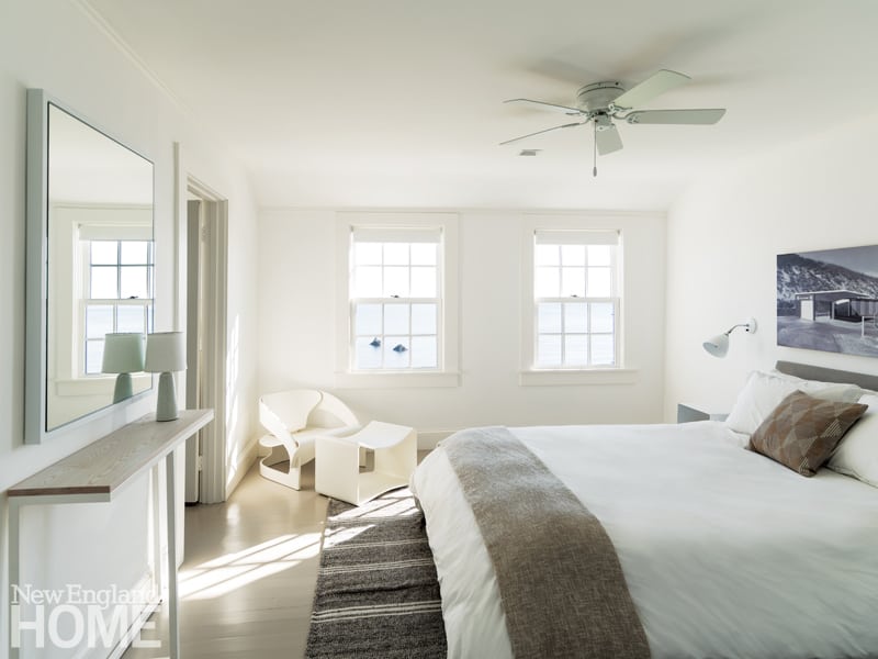 To emphasize the summer-by-the-sea feel, walls and ceilings got a fresh coat of white paint. The new sunroom may stand as the best example of the home’s refined coastal style. The design team reimagined the old poorly tacked-on porch, and Grenier transformed it into the gorgeous space it is now. If the water view were not so enchanting, the furnishings might steal the show, especially the quartet of Blackman Cruz Acapulco rockers. A glass coffee table that sits on a rug woven from paper yarn keeps the room airy.