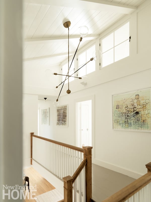 The revamped home celebrates light. “We opened up a lot of the windows and redesigned them, making them much bigger than the originals to enhance the views and make the interiors much, much brighter,” says Mitchell. In the dining room, a new picture window with side panels complements the original six-over-six panes. The upstairs hall and stairwell are flooded with natural light, but the sunny glow doesn’t come from the clerestory windows, which are not on an exterior wall at all. On the other side of the windows is a skylight-like chute that leads up to the new dormers, the actual source of the light.