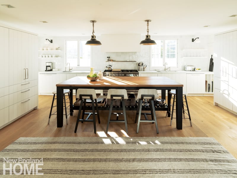 The statement-making kitchen design was a collaborative effort. The black table/island base, counter stools, and pendant lamps stand in sharp contrast to the white of the planked cabinetry, marble countertops, and a back wall covered floor-to-ceiling in white Moroccan tile. The abundance of textures and sheens was intentional, says Wells: “There’s a dull floor, dull white walls, and shiny tiles. The plaster of the range hood is chalky, the rug is woven. All in all, it’s a very tactile space.”