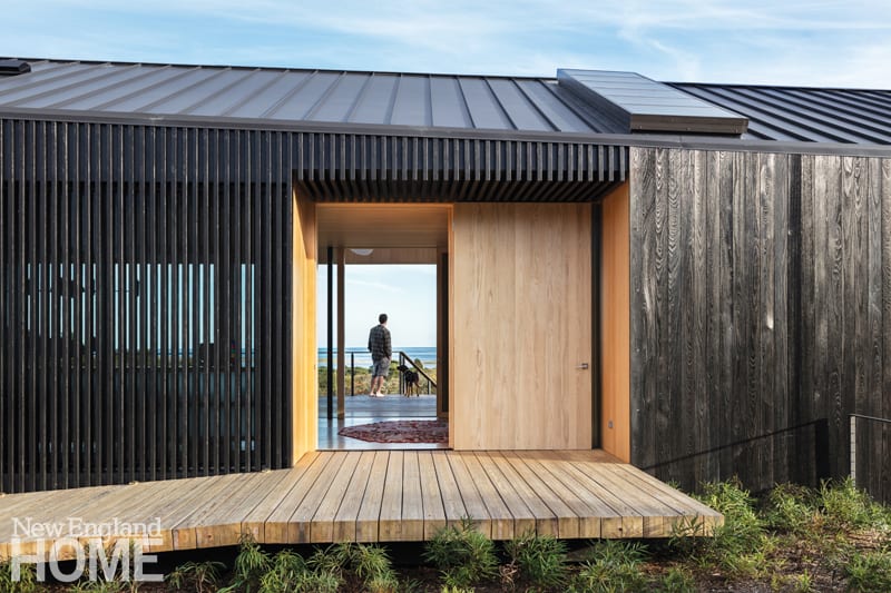 Designers and architects often talk about “bringing the outside in,” creating a house with a strong connection between the interior and the outdoors. In the case of this Chappaquiddick home, that is a serious understatement. Architect Peter Rose let the woods, wetland, and coastline of the property play the starring role. The 6,300-square-foot main house follows the undulations of the land and is organized around a central axis that looks out to Cape Poge Bay in one direction and the Atlantic Ocean in the other. To one side of the axis, the public areas occupy a single level. On the other side, a two-story wing drops down into the landscape, making a surprisingly compact package for the seven bedrooms and four baths within. In the main living space, Douglas fir ceilings and walls of fir and beech echo the outdoors. The wood, particularly where the framing is exposed, “makes the house feel more elemental, almost as if it doesn’t really have windows, doors, electricity,” Rose says. Cementing the connection with nature are the ingeniously designed glass walls crafted by Parry Windows and Doors, a Martha’s Vineyard company. The mahogany-framed glass slides completely out of view, immersing the home in the sights, sounds, and smells of the sea.