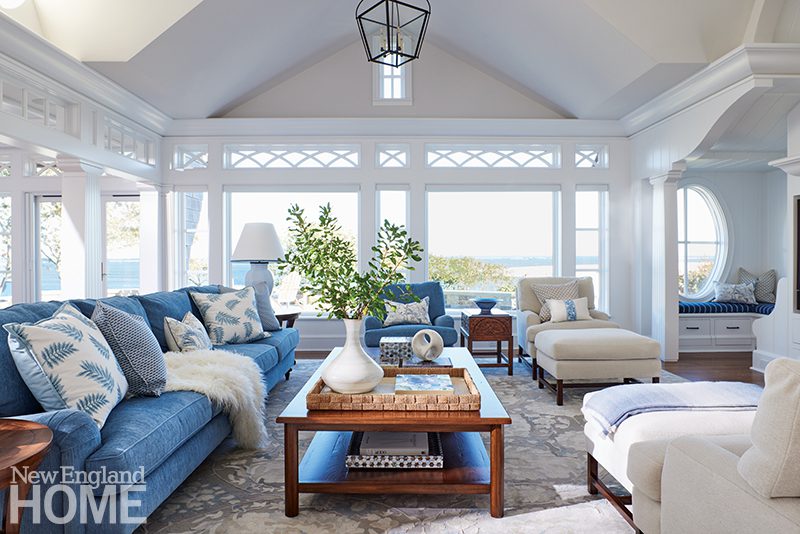 The homeowners took a more traditional approach with the decor, which was designed by Susanne Lichten Csongor of SLC Interiors. “They wanted something that felt comfortable and kind of refined, but without feeling too stuffy,” notes SLC’s Joseph Chartier-Petrelis. Working within the owners’ preferred palette of blue and white, Csongor anchored one side of the family room with an eleven-foot sofa, which she paired with plump easy chairs and ottomans covered in indoor-outdoor fabrics so they stand up to anything.