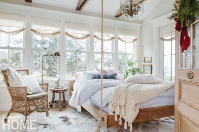 “This holiday we’re all looking for escapism,” she says. “We’re stuck at home, and we want it to be festive.” The Old Silver Shed is undeniably festive no matter the season, with its silver-gray weathered shingles, glowing lanterns, and rustic beams. Vignette-like spaces include a campy, porch-style guest room with a bed that appears to swing from the ceiling, and a kitchen nook with double Dutch barn doors that fling open to the deck. At 6,000 square feet, it’s not much of a shed anymore, but Cavallo’s dedication to detail meant she kept original ceiling heights, opting for intimate spaces over modern great rooms. “I wanted the coziness of a cottage with [similar] proportions, not soaring high ceilings,” she says. Fortunately, that cottage style lends itself perfectly to capturing the holiday spirit.