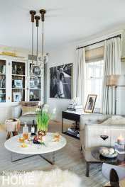 Frequently embracing a woodland holiday theme, Cavallo fills her already-neutral home with lots of texture and natural objects with minimal color. Soft, “snowy-like” sheepskins are layered everywhere. Woodland animals rest under glass cloches, while an owl sits on a vintage console, surrounded by branches. Woodsy accent chairs pull up to the kitchen table. The dining room is adorned with winter-white candles and a centerpiece wreath