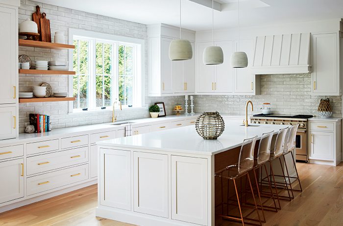 Shiny surfaces and statement lighting add a luxe touch to a Connecticut kitchen.