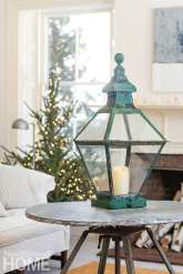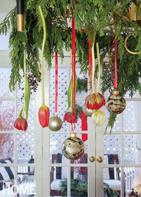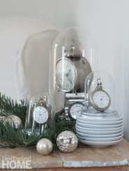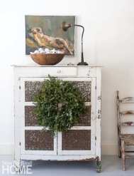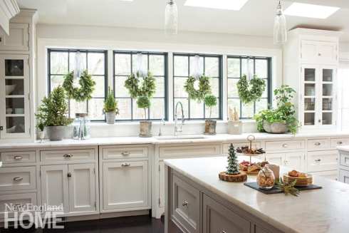 Sandra Sigman created a mini snow scene in a glass canister, which she smartly paired with a treetop anchored in sand. Sigman sets tables throughout the house; in the kitchen, the floral designer ran a simple centerpiece of fresh treetops surrounded by princess pine along the table to encourage the flow of conversation. The festivity continues with myrtle topiaries and eucalyptus wreaths.
