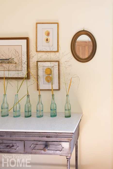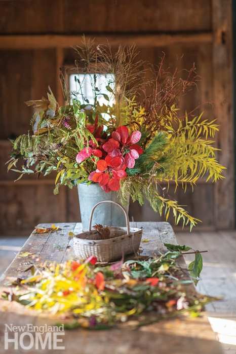 Although Elliott confesses to being a “spring person,” he does like to make merry for the winter holidays. That can shake down into a lineup of simple, spare grass plumes tucked into vintage bottles found in the wall while renovating, or it can mean voluptuous arrangements concocted while wandering his hedgerows. Those bouquets come together in his hands as he walks along, adding smoke bush, conifers, and grasses. In the barn, stems are stripped and lines are perfected. The vision is to live close and personal with the nature he loves.