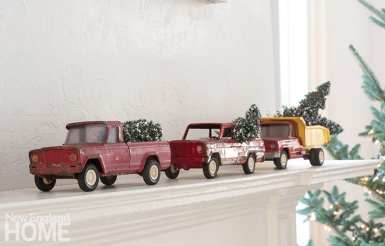 Atop an early-1800s pie safe that he picked up in Pennsylvania sits Woods’s grandmother’s wooden bowl, which she used to make bread stuffing every holiday. With a camelback sofa and softly lit tree, the living room is accented by a galvanized swivel table holding a welcoming lantern. Clocks and watches (including his father’s) symbolize that time is of the essence. The colorful vintage toy pickup collection is the brightest element in the room, so it stands alone.
