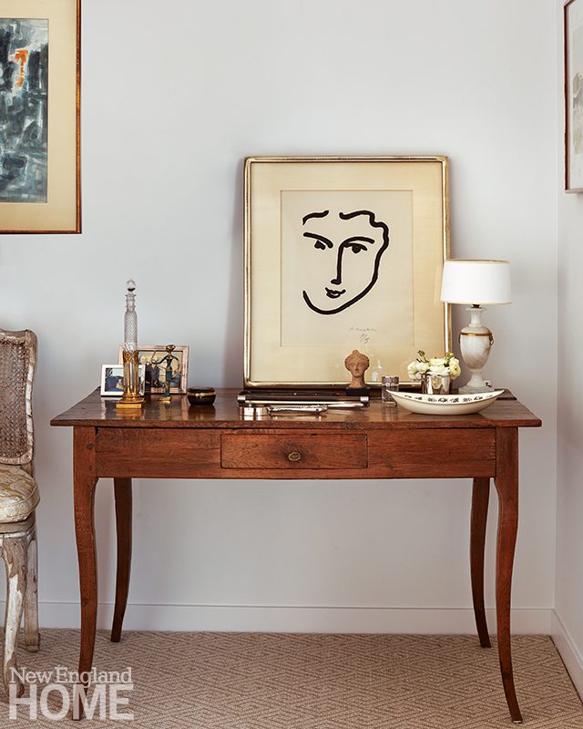 Spada had designed Adelson and her late husband’s Back Bay apartment, and both designer and homeowner were determined to repurpose as many elements as possible in the new home. “We worked very, very hard and moved dozens and dozens of pieces around to get it all to fit,” says Spada, referencing, in particular, the artwork. “I wanted to use all of the pieces and the furnishings—and, down to the last, we placed it all, even though windows take up lots of wall space.”