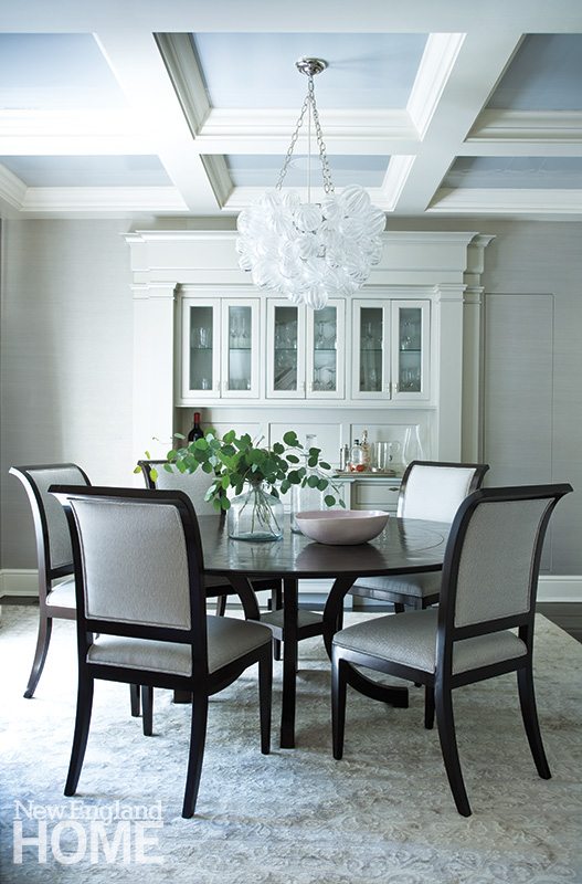 The dining room is a case in point. Setting the mood for the rest of the house, Rosier installed a silver wallpaper and lacquered the ceiling a high-gloss blue. The cabinetry was painted light gray for contrast. The showstopper? “The bauble chandelier makes an unexpected statement, yet works with the classical table and chairs,” says Rosier.