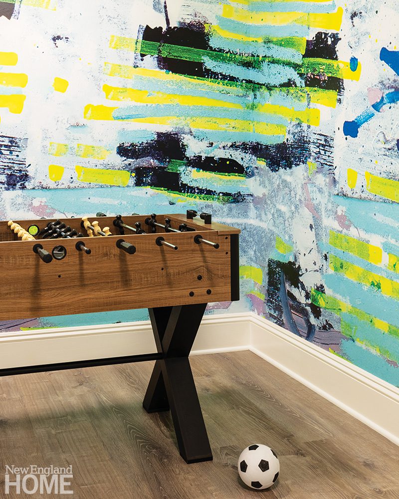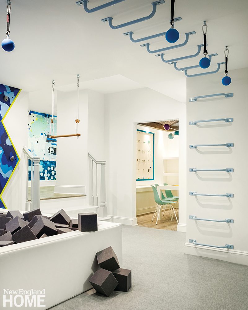 The main space feels like a gymnastics studio—or the set of American Ninja Warrior—with its monkey bars, rock wall, climbing ropes, and sundry swings and trapezes. Kids can climb across the room and drop into a ball pit. A mini sport court invites younger children to play basketball and soccer or knee hockey. Because Bowen-Poole’s playrooms are designed for longevity, she added a foosball table to the mix. She incorporated a lower-than-usual Parsons-style table that seats four kids for the art/Lego area.