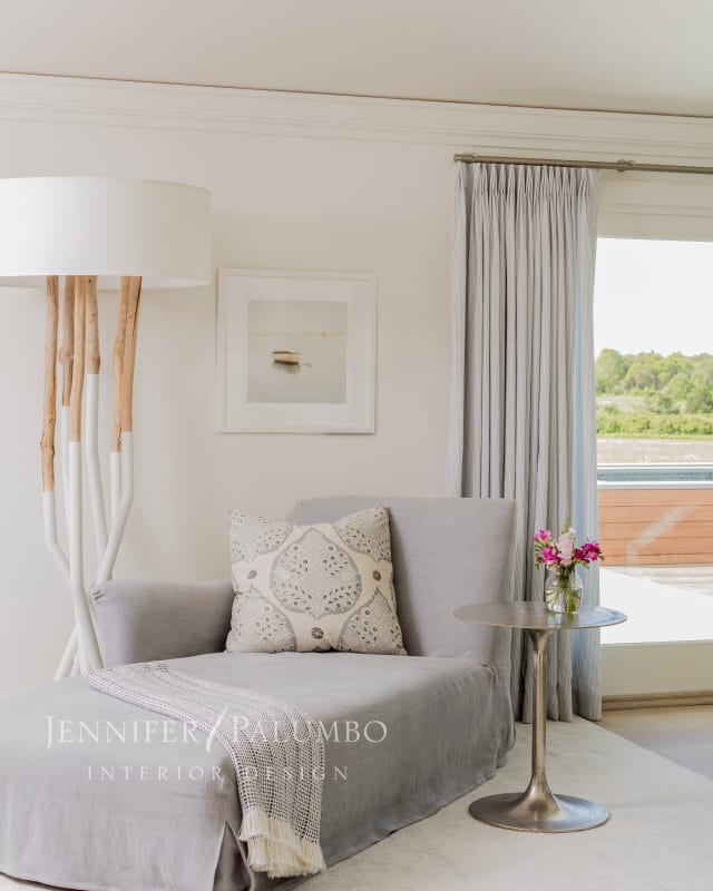 In the coastal home above, Palumbo and her team chose a large, sculptural floor lamp to serve as a feature of the room. “The scale is imposing, so it almost functions as an art piece in the vignette. It also helps define this reading nook within a bigger space that also has a TV area and a workspace.”