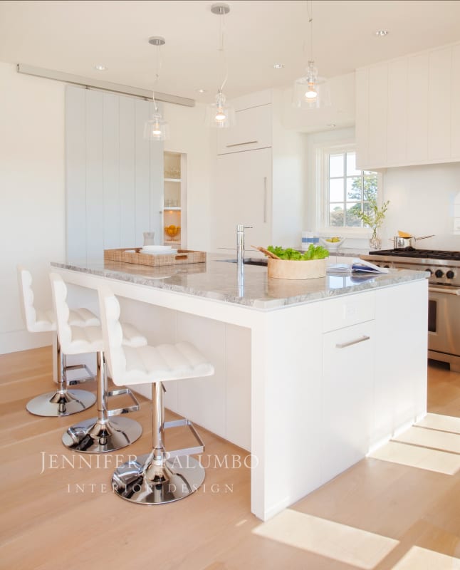 Finally, in a bright and modern kitchen, Palumbo chose glass fixtures to add dimension to the space while maintaining the clean design. “The intention of the light was to introduce a new material, the transparent glass, but do it in such a way that it fits the light-and-bright aesthetic of the house,” Palumbo explains.