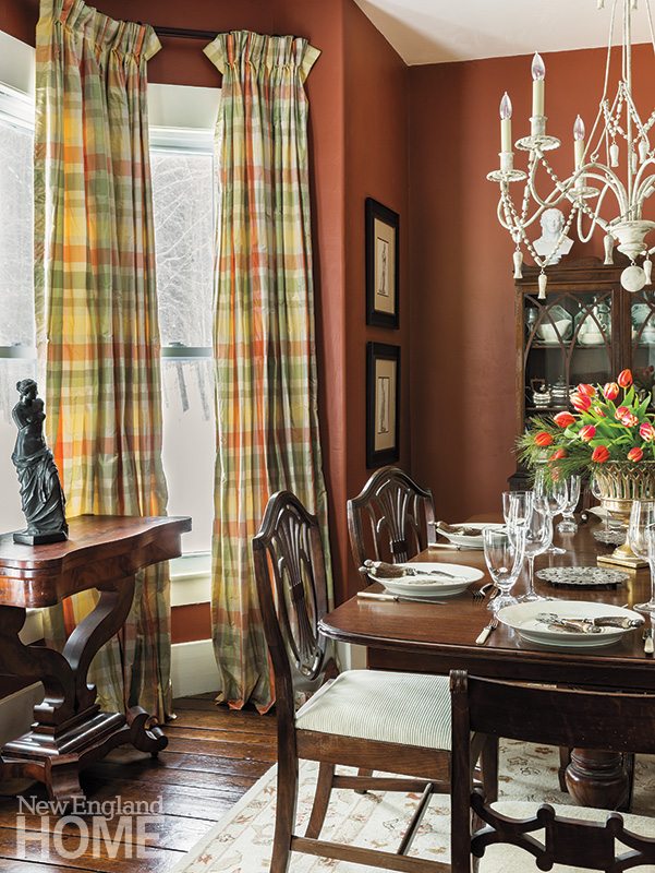 Eras and styles winningly intermingle, upping the artful ambience. The ruddy-colored dining room, for example, painted Benjamin Moore’s Georgian Brick, is home to a 1940s table set with horn-handled cutlery. The mahogany Empire card table alongside the window displays a bronze Venus de Milo, the glass-front cupboard reveals a pedigreed silver teapot and a helping of Bell’s beloved Wedgwood collection, and above it all hangs a tasseled and beaded chandelier from Visual Comfort.