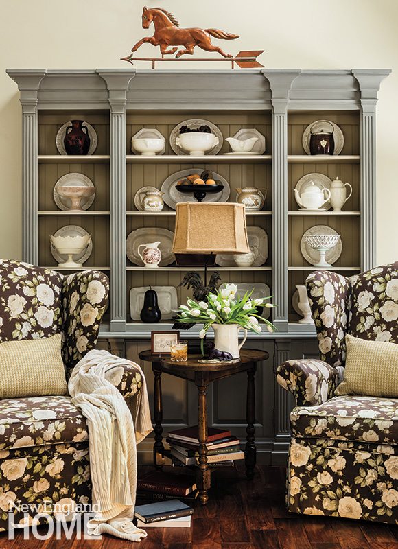 Bell’s ability to hit just the right balance is obviously in his DNA, and that talent is evident again in the family room that abuts the new kitchen. Here, Bell has found a spot for his prized Bernhardt hutch, where caches of ironstone and Wedgwood Edme Queensware reside. Twin wing chairs wearing a decidedly English-like floral fabric nestle close to the hearth. Bell designed the fireplace mantel, where more Wedgwood is on display, and installed the granite surround himself.