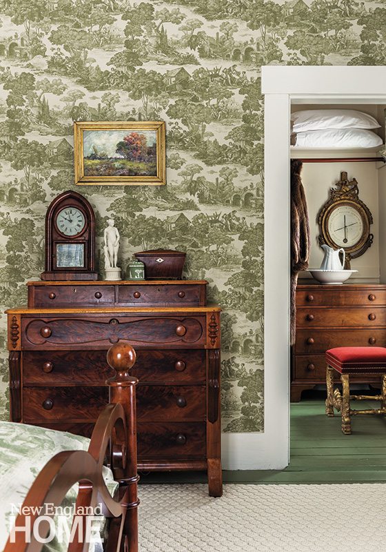 It doesn’t matter what the season, friends and family clamor for invitations. Their room (if garage accommodations, which include a kitchenette, are spoken for) is clad in toile. “I’ve always wanted a toile room, and since it’s a guest room, we don’t see it every day,” Bell says, although that would hardly be something to fret about. The dreamy green-and-white pattern is as fresh as the nearby woods. The green-painted old floor evokes outdoor thoughts as well—a reassuring touch in these parts when spring seems a long way off. The adjoining walk-in closet, complete with pine dresser, was once a nursery. It must have been a happy little niche then, and it still is. Come to think of it, there’s not a corner of this charming, well-curated house that doesn’t feel warm and welcoming. •