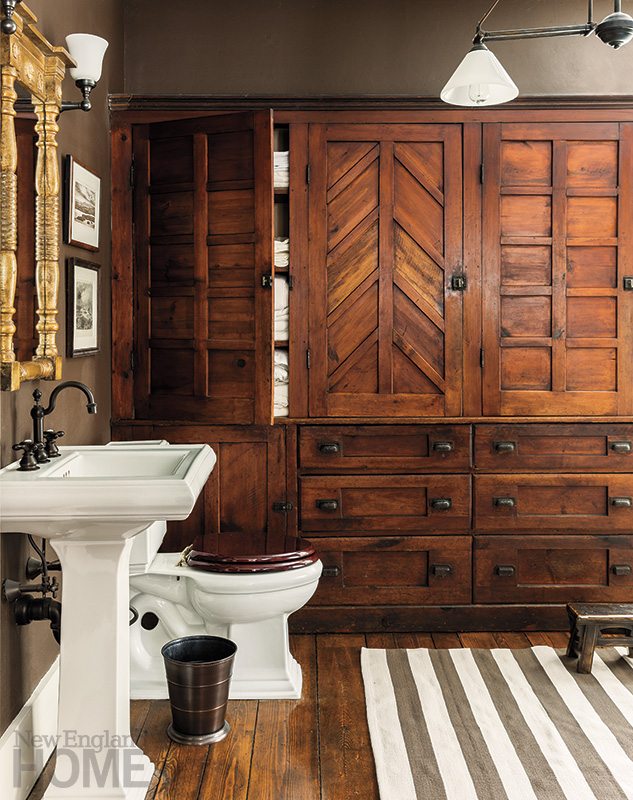 The appealing powder room is another thoughtful study in past and present. Bell and McBournie transported the oversize handmade cabinet that formerly stood in the pantry to nest their linens and sundries.An antique Federal-style mirror hangs above the Kohler sink.