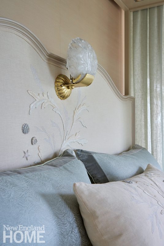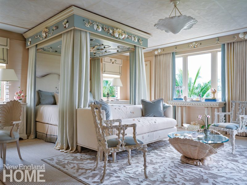“We worked with local artist Robin Grubman to create the underside of the canopy,” says Stebbins of the shell-encrusted piece. “We gave her a blueprint, but Robin ran with it. We sourced many of the shells from the Philippines. They are nature’s antiques.”