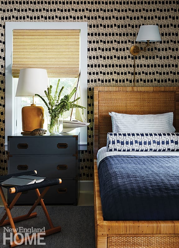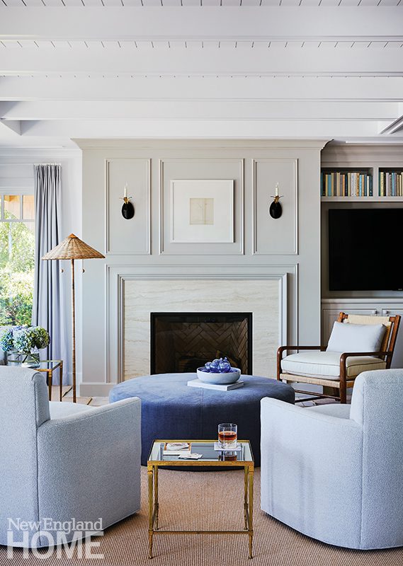 For the seating area, Tharp replaced the fireplace surround with floor-to-ceiling paneling reminiscent of Colonial-era Cape Cod. “We wanted to introduce a sense of age not through distressing and patina, but in classicism in the detailing,” she says. The result, partly inspired by the homeowner’s admiration for design icon Jackie O, is gracious and elegant, yet still crisp and fresh.